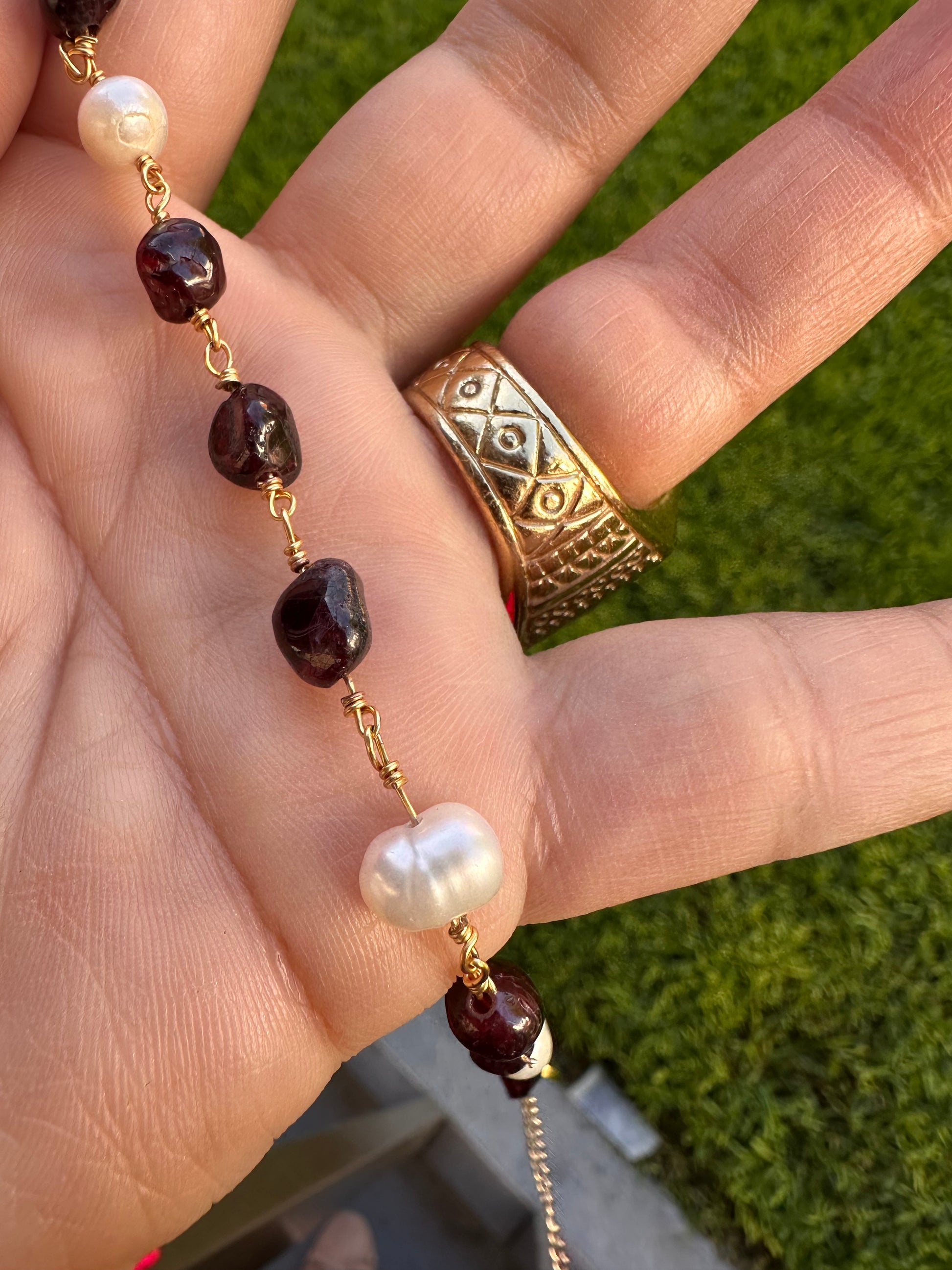 * Perlas Naturales de Río: Cuentas cuidadosamente seleccionadas, cada una con su brillo orgánico y su forma única. Representan la sabiduría adquirida a través de la experiencia, la pureza del espíritu y la calma que emana de la conexión con la naturaleza. Aportan un toque de luminosidad suave y clásica, evocando la tranquilidad de las aguas donde nacen.