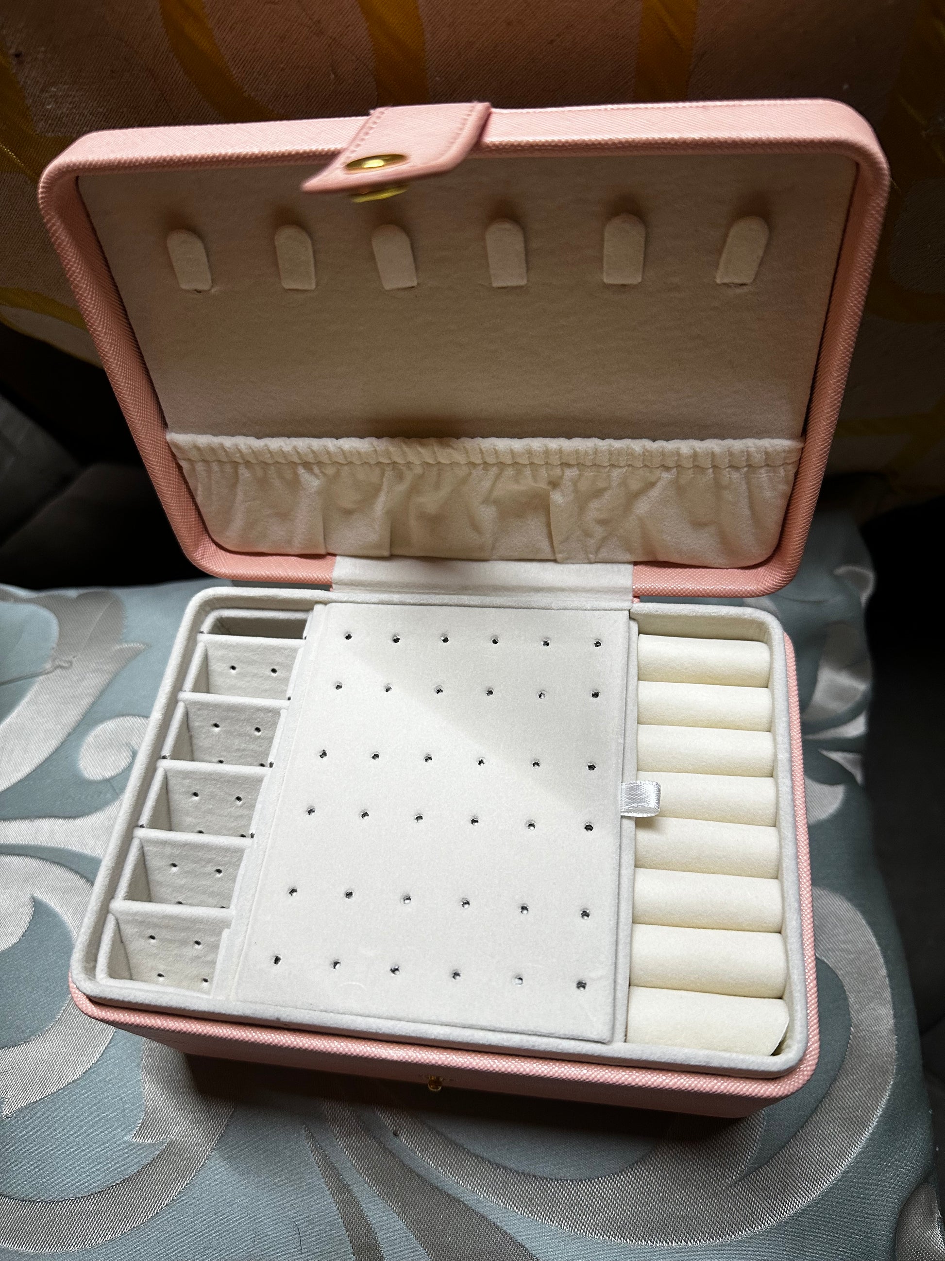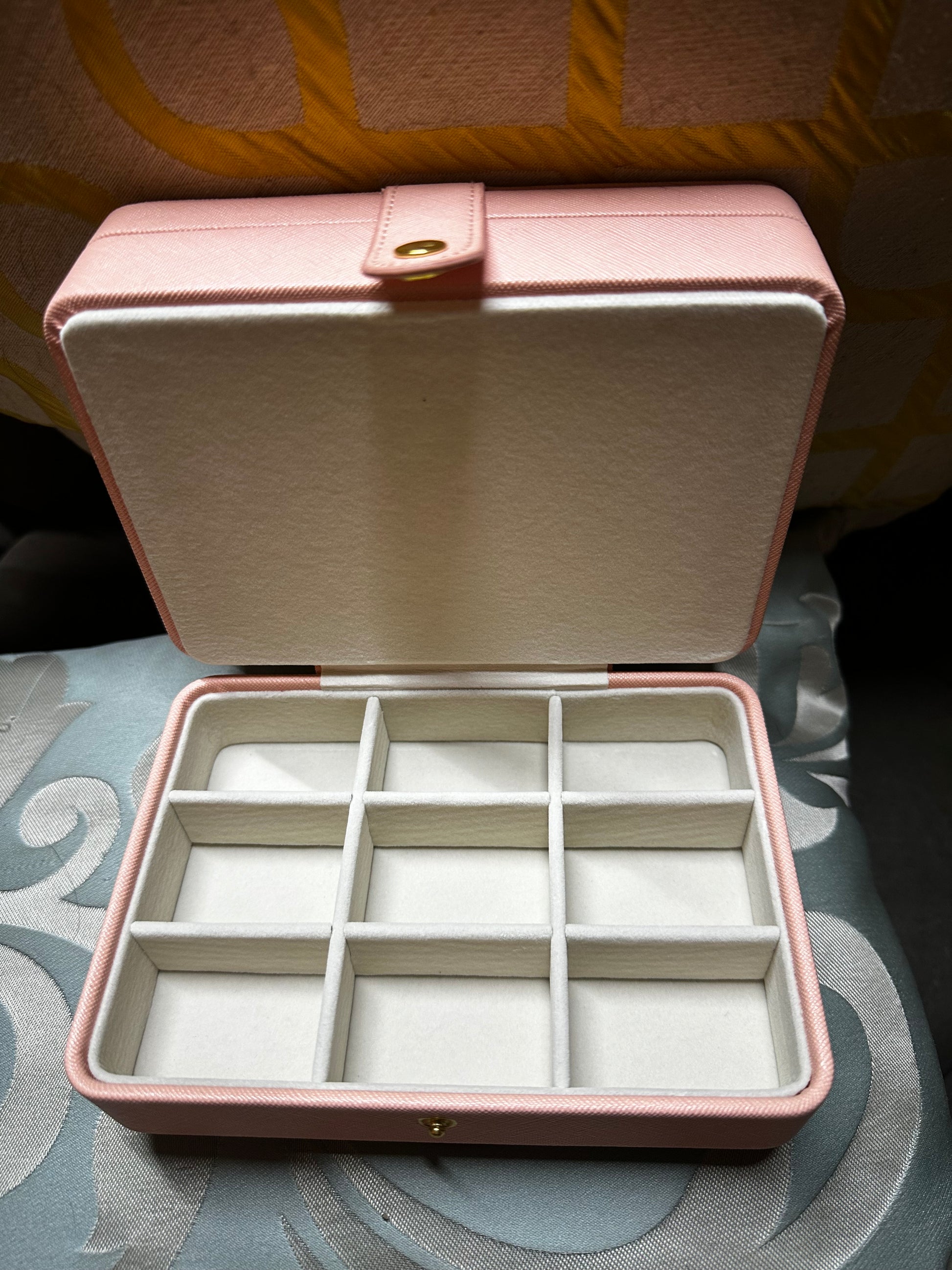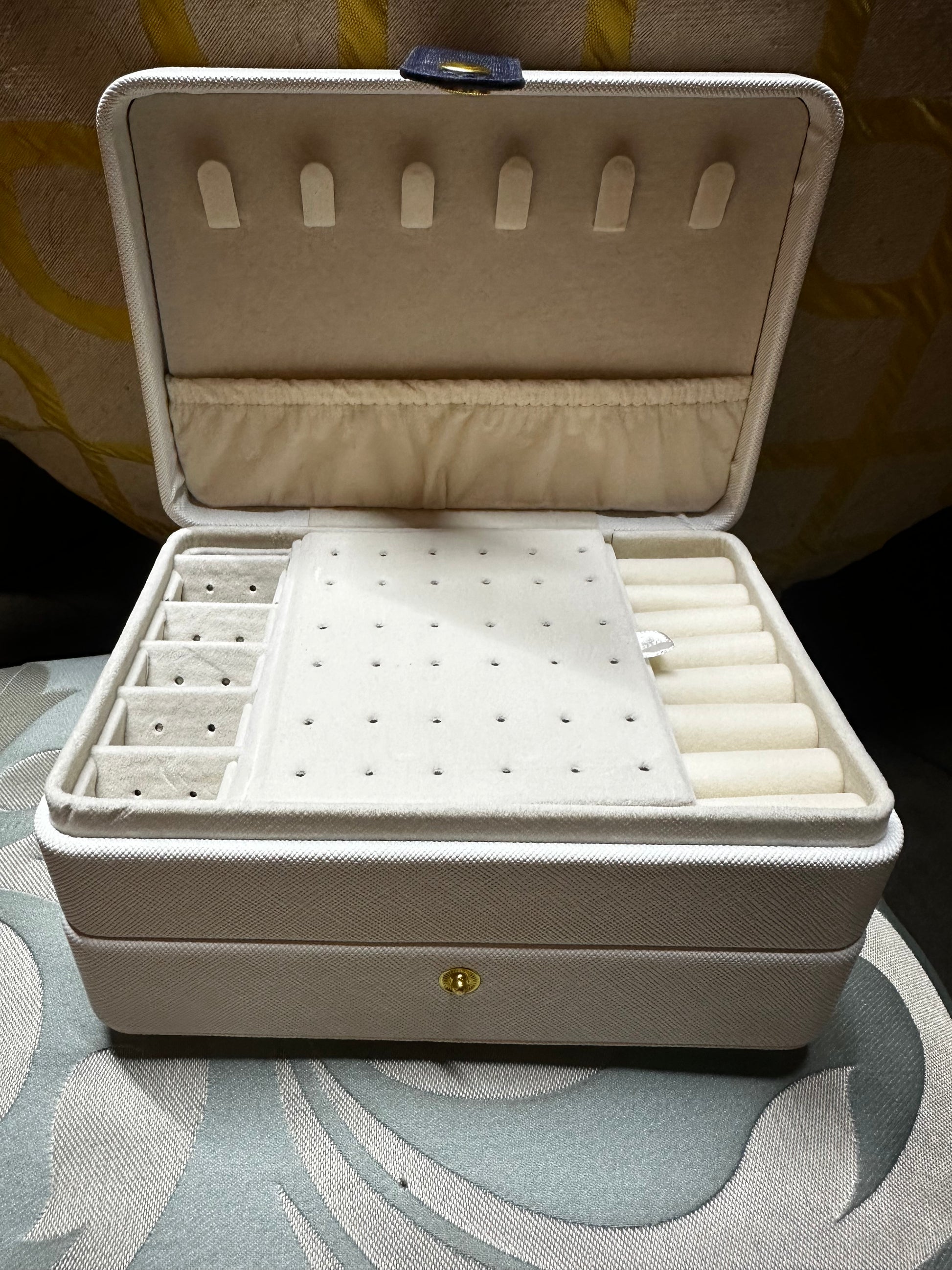 Nuestro alhajero de viaje está meticulosamente confeccionado con materiales de alta calidad que garantizan durabilidad y una apariencia sofisticada. Su tamaño mediano es ideal para llevar en tu maleta o bolso de mano, asegurando que siempre tengas tus joyas favoritas al alcance. El exterior resistente protege contra golpes y rasguños, mientras que el interior suave y aterciopelado cuida tus piezas delicadas, evitando cualquier tipo de daño.