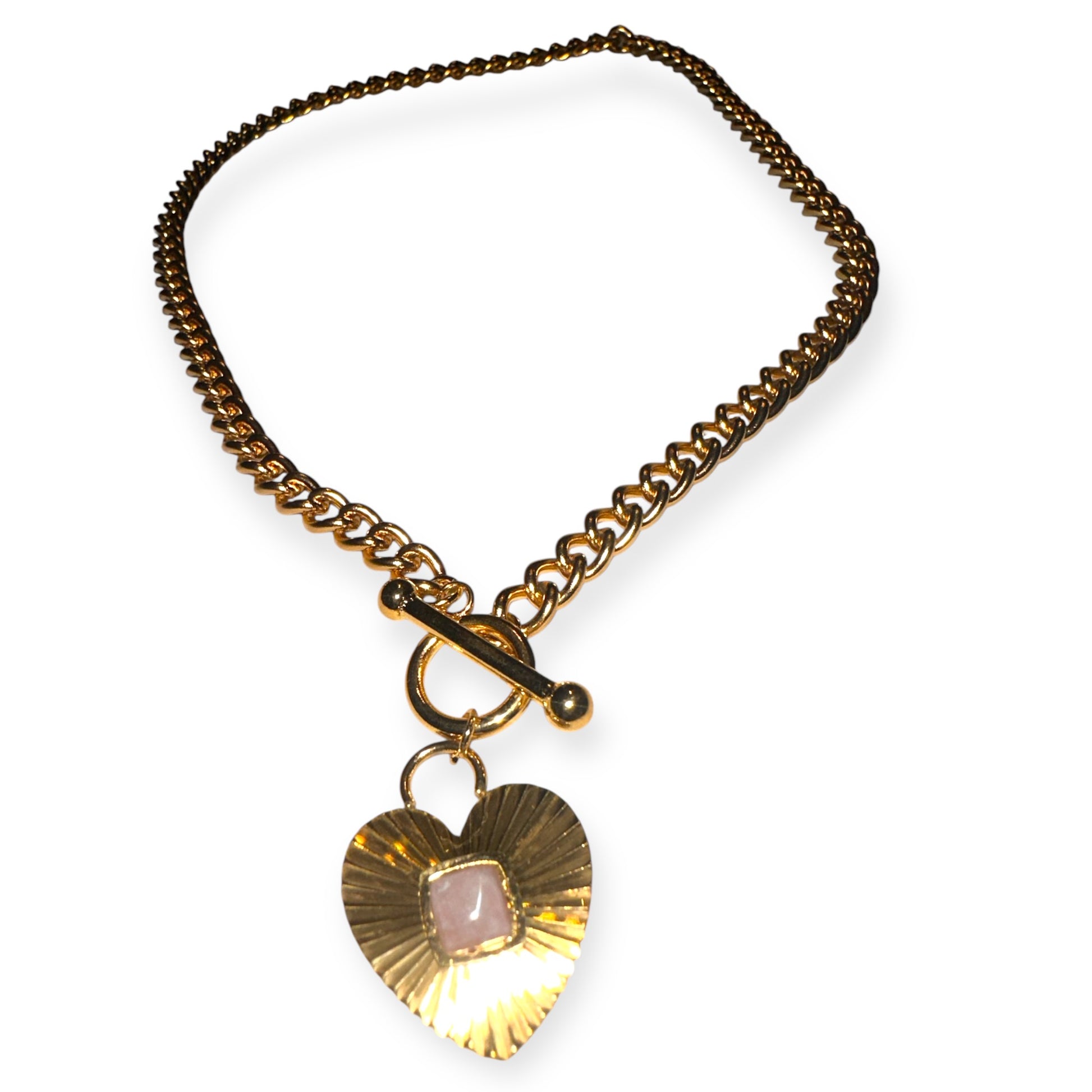Dije de Corazón con cuarzo rosa: El punto focal del collar Anastasia es un exquisito dije en forma de corazón, adornado con un delicado cuarzo rosa al centro.