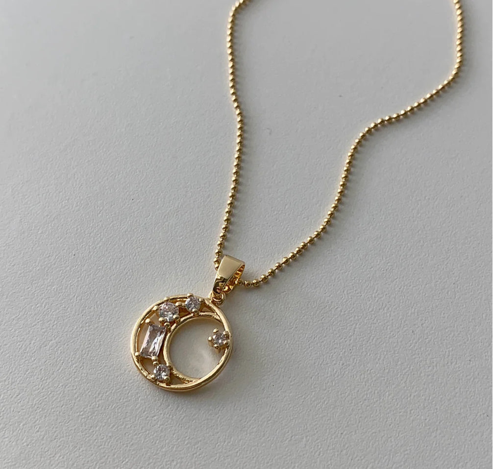 Presentamos el collar Daniela, una joya sofisticada que combina el lujo de la chapa de oro de 14k con un diseño único y significativo. Adornado con un dije circular que contiene una circonia en forma de luna y otras circonias alrededor, este collar no solo es un accesorio elegante, sino también un símbolo profundo de guía, protección y misterio.